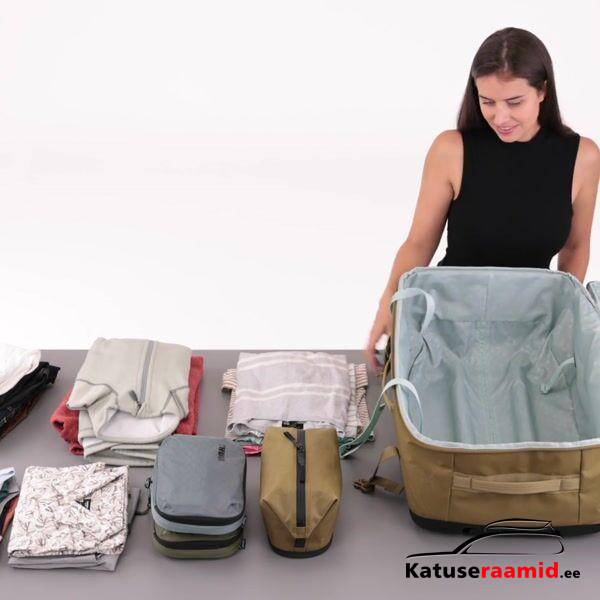 - Sisemised ja välimised kokkusurumisrihmad hoiavad esemed paigal ja aitavad kotti kokku suruda